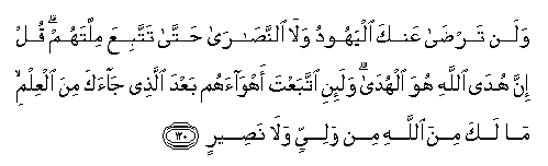 | 34 | Surah AlBaqarah. Ayat 120. ![]() Orang-orang Yahudi dan Nasrani tidak sekali-kali akan bersetuju atau suka kepadamu (wahai Muhammad) sehingga engkau menurut agama mereka (yang telah terpesong itu). Katakanlah (kepada mereka): Sesungguhnya petunjuk Allah (agama Islam itulah petunjuk yang benar dan demi sesungguhnya jika engkau menurut kehendak hawa nafsu mereka sesudah datangnya (wahyu yang memberi) pengetahuan kepadamu (tentang kebenaran), maka tiadalah engkau akan peroleh dari Allah (sesuatupun) yang dapat mengawal dan memberi pertolongan kepadamu. |