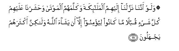| 38 | Surah AlAn'aam. Ayat 111. ![]() Dan jika Kami turunkan malaikat pun kepada mereka dan orang-orang yang mati (hidup semula lalu) berkata-kata dengan mereka dan kami himpunkan pula tiap-tiap sesuatu di hadapan mereka (untuk menjadi saksi tentang kebenaran Nabi Muhammad), nescaya mereka tidak juga akan beriman, kecuali jika dikehendaki Allah; tetapi kebanyakan mereka tidak mengetahui (hakikat yang sebenar). |