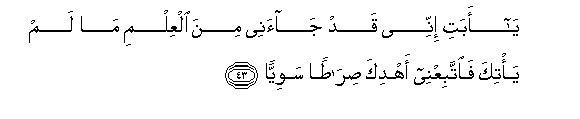 | 33 | Surah Maryam. Ayat 043. ![]() Wahai ayahku, sesungguhnya telah datang kepadaku dari ilmu pengetahuan yang tidak pernah datang kepadamu oleh itu ikutlah daku; aku akan memimpinmu ke jalan yang betul. |