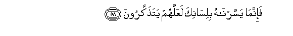 | 35 | Surah AdDukhaan. Ayat 058. ![]() Maka sesungguhnya tujuan Kami memudahkan Al-Quran dengan bahasamu (wahai Muhammad), ialah supaya mereka (yang memahaminya) beringat dan insaf (untuk beriman dan mematuhinya). |